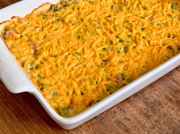 Using just a few budget friendly ingredients including instant rice, precooked ham, frozen peas, and a can of cream of chicken soup, you can make a delicious dinner casserole that’s easy to make on busy school nights, even for the laziest of cooks. You could even make it ahead of time and simply pop it in the oven when everyone is ready to eat!