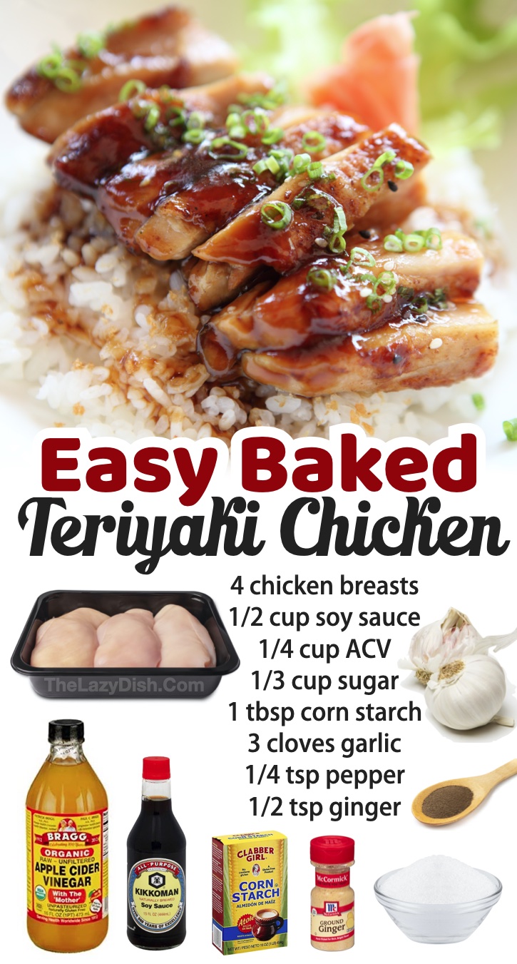 This amazing sweet and salty baked chicken is perfect for busy weeknight dinners. Simply mix all of the ingredients together in a pot and simmer until it thickens. Pour the heavenly teriyaki mixture over your chicken breasts in a baking dish and bake until tender and juicy. Serve with rice, vegetables, or salad to make a complete meal.