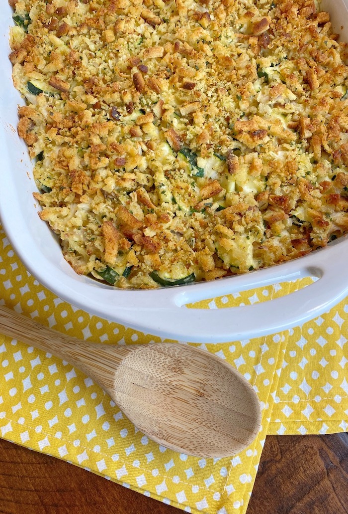 1. Preheat your oven to 350 degrees and grease a 9x13 baking dish. 2. In a large bowl, melt the butter and then mix with the box of dry stuffing mix; set aside HALF of the mixture for topping the casserole later. 3. Add the pulled chicken, diced zucchini, cream of chicken soup and sour cream to the stuffing and mix well. 4. Spread the mixture into your baking dish and then evenly sprinkle the top with your reserved stuffing mixture. 5. Bake, uncovered, in the middle rack for 35-45 minutes or until it's warmed through and the top is golden brown.